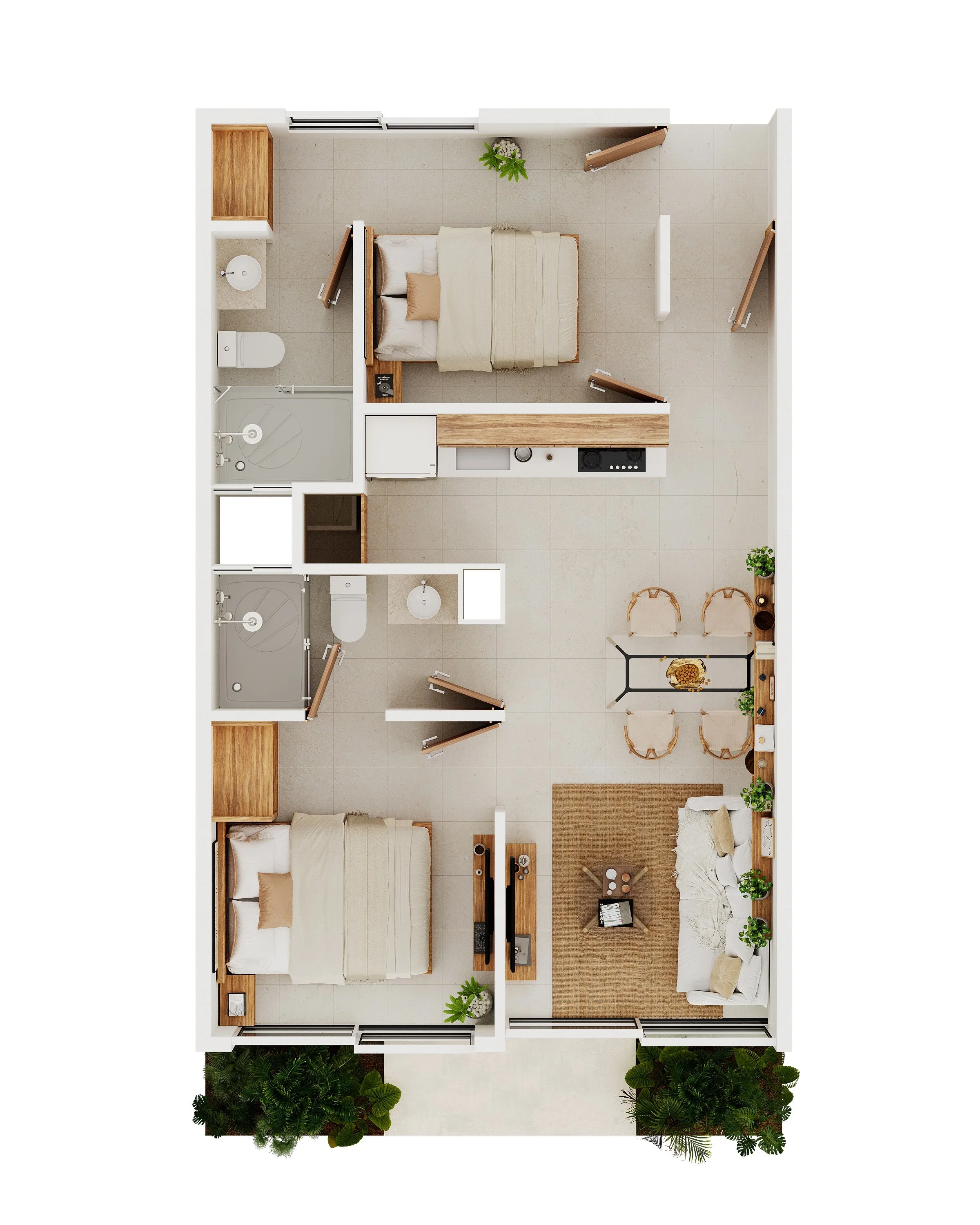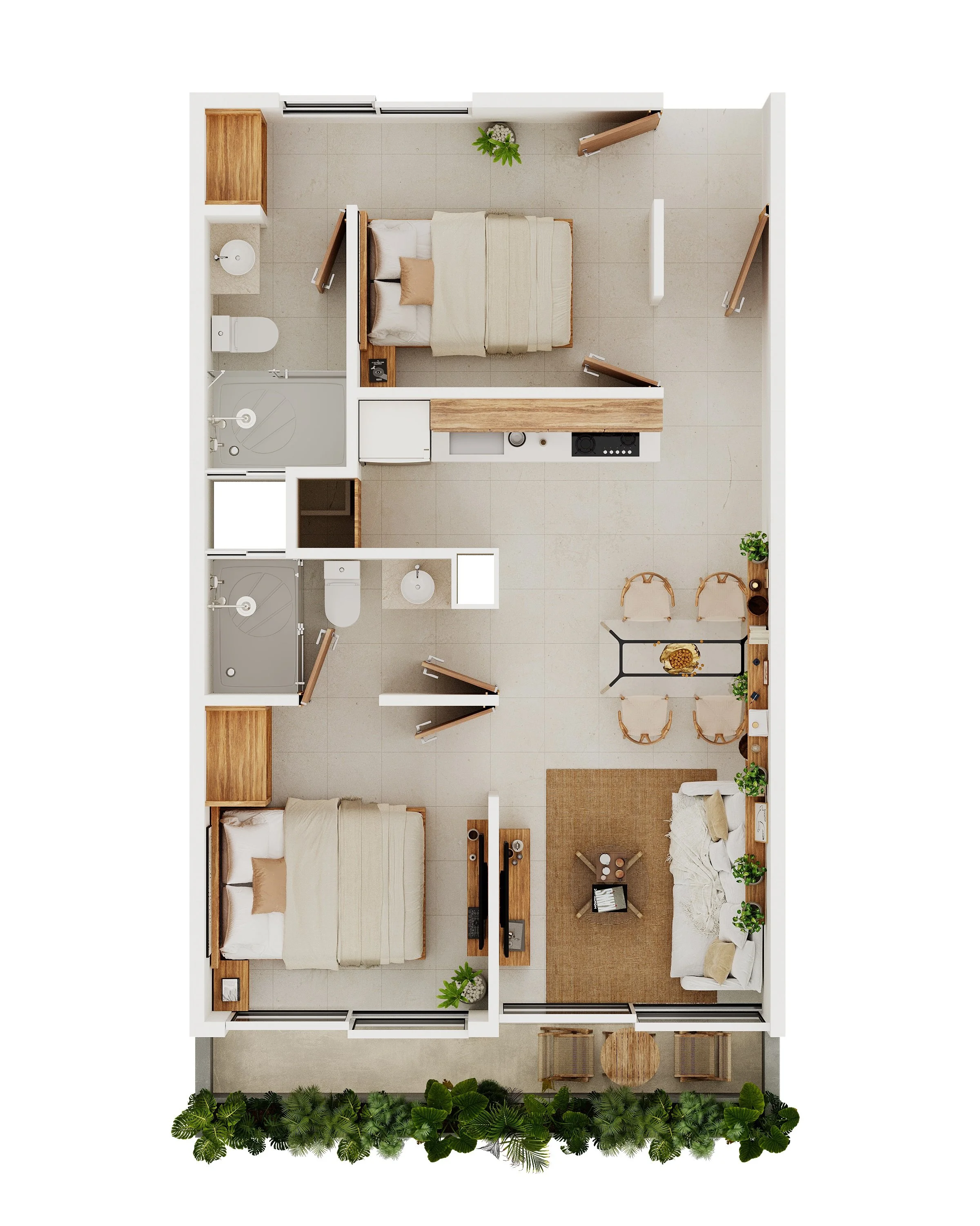 Son 51 departamentos en total, todos de 2 recámaras tipo lock-off, lo que te permite dividir el espacio y rentar por separado si así lo deseas.